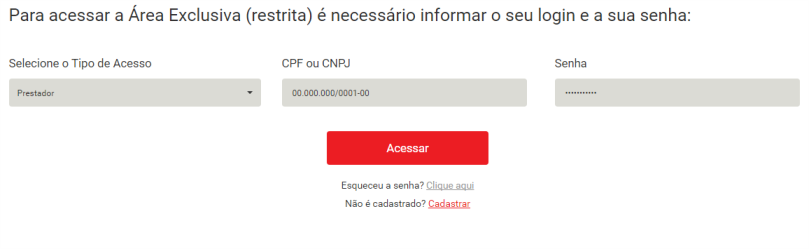 OBS: Somente para prestadores ainda não cadastrados, preencher o formulário em nosso portal clicando em Não Sou Cadastrado: cadastrar na parte inferior da página e seguindo as instruções na tela. Terminado o cadastro, realizar o login (Passo 1).